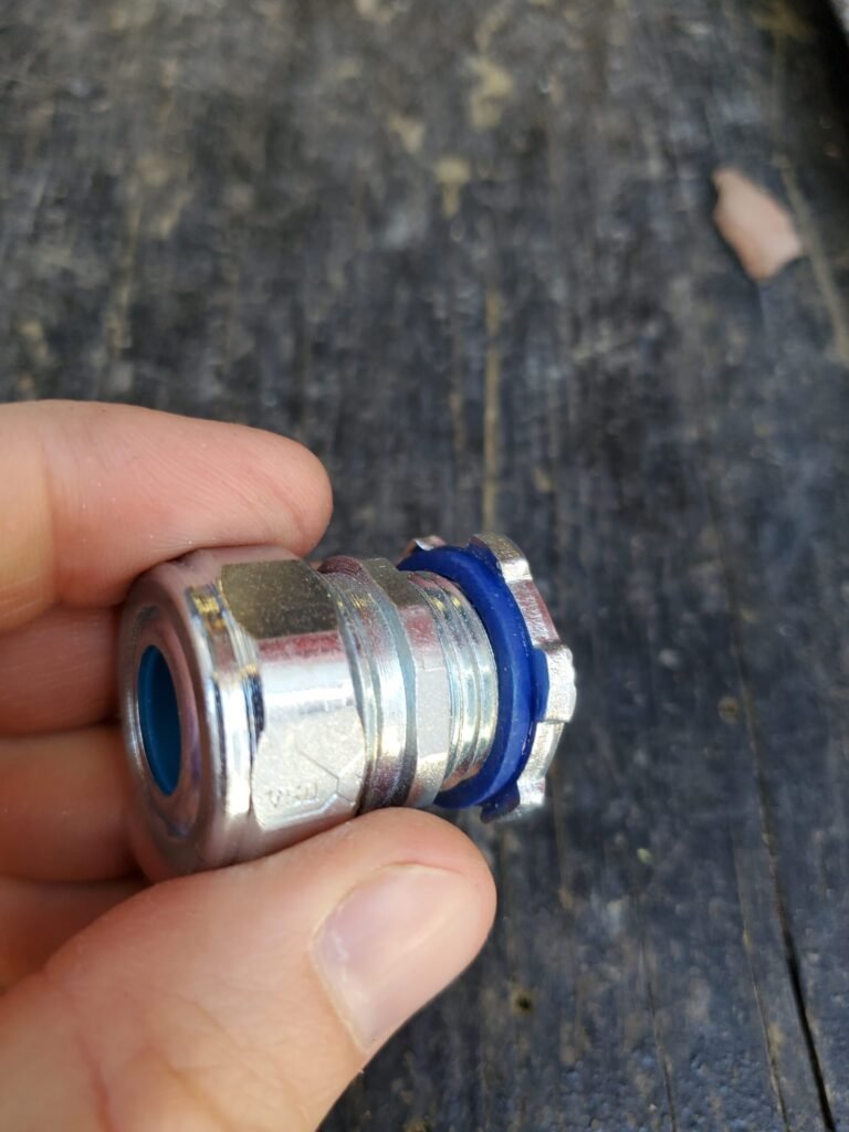 Our standard: We use high‑quality, chrome‑coated stainless‑steel sealing strain‑relief connectors—properly sized to each cable—with added sealing such as rubber washers and locking ring gaskets. The metal body provides robust mechanical grip, genuine waterproofing, and consistent compression that doesn’t degrade after multiple opens for maintenance. Many arrive colour‑coded, which helps eliminate installation errors and speeds service later on.