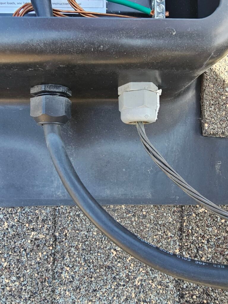The common shortcut: Many installers use inexpensive plastic “weather‑resistant” cable glands inside arrays or on rooftop junction boxes. They’re fragile in cold, degrade under sun (UV), rely on light compression for sealing, and can crack or lose grip after a few service cycles. In freeze‑thaw, capillary action can draw moisture into boxes; snow loads can bury connections; and plastic fatigue is real. Sometimes they don’t use connectors at all and just hide illegal work under the arrays!