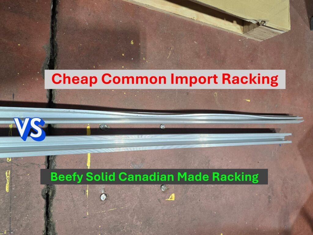 Our standard: Canadian‑made racking engineered for higher strength and rigidity. Thicker sections, stronger alloys, heavier clamps that are meant to be re‑used, and solid hardware blocks with engagement teeth (not flimsy springs). We design for real‑world thermal movement, wind loading, and long‑term serviceability.